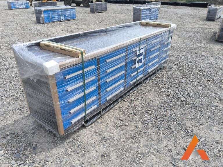 10' 25 Drawer Metal Work Bench, 120"L X 25"W X 33" H, blue, ball bearing drawers