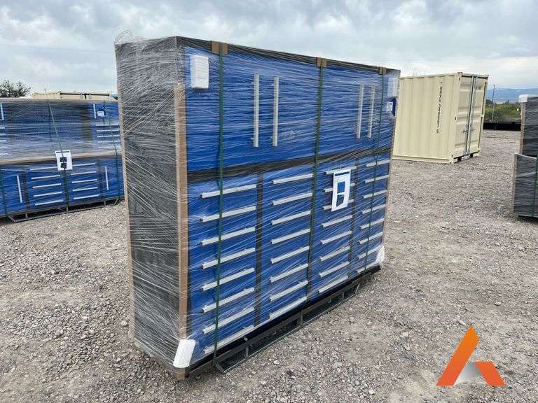 7' 32 Drawer Metal Work Bench, 87"L X 23"W X 67" H, blue, ball bearing drawers