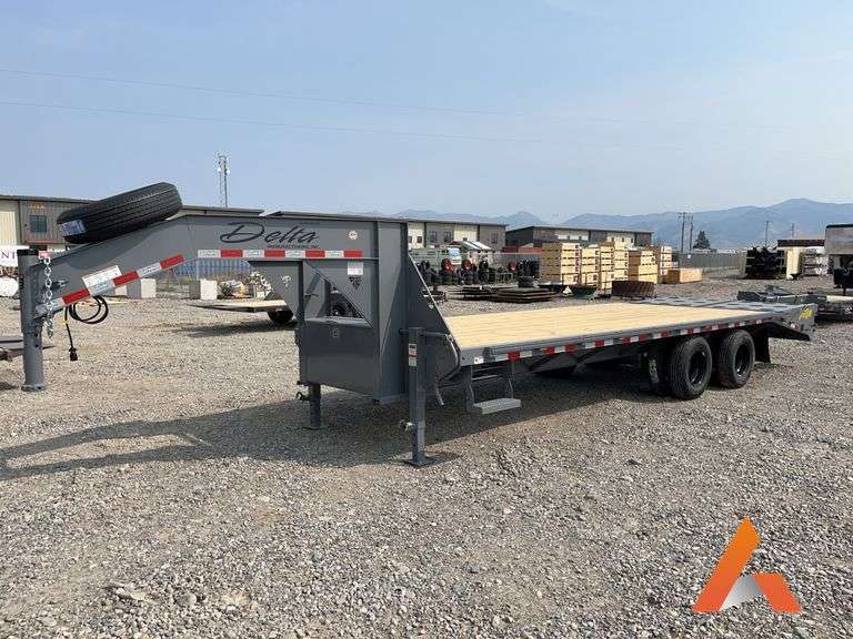 (unused) 2025 Delta 25' x 101" flatbed trailer, gooseneck, 20' deck w/ 5' Super Ramp, 23,400lb GVWR, tandem axle, dual wheels, cement grey, tool box, led lights, brakes, ST235/80R16 tires, Vin# 4MWGF2521TN071260