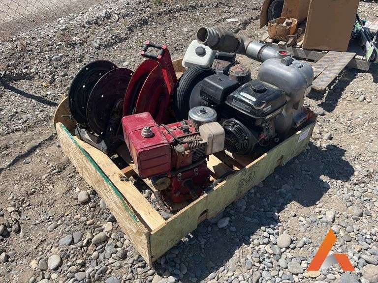 Two misc hose reels poor condition, 3 wheel barrow wheels 4.80/4.00-8, Honda GX120 5.5hp engine not tested, Honda GX240 8hp engine attached to Multiquip contractor pump 3x3 Model QP-301TH Serial No. 301TH-8044 not tested, Briggs and Stratton 8hp industrial/commercial engine not tested, 3 misc orange strobe lights not tested, Misc plastic boards 4x no known use