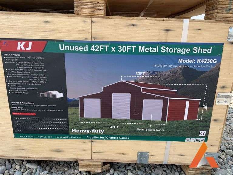 K4230G includes Box A + B, overall dimensions: 30' (L) X 42' (W) X 13' (H), wall height: 8', mainframe: 14-gauge 2.3" square tube, 14-gauge 2.3" X 4.3" galvanized tube, 14-gauge 4.3" square tube, top cross brace: 14-gauge 1" X 1.8" galvanized tube, sheet metal gauge: 26-gauge, three rolling doors: (2) 8.2' (W) X 7.2' (H), (1) 8.2' (W) X 9.2' (H), one side entrance door: 2.9' (W) X 6.9' (H), one sliding window: 2.7' (W) X 3.3' (H), concrete anchors: 6" long, 1/2" diameter, color: red-brown