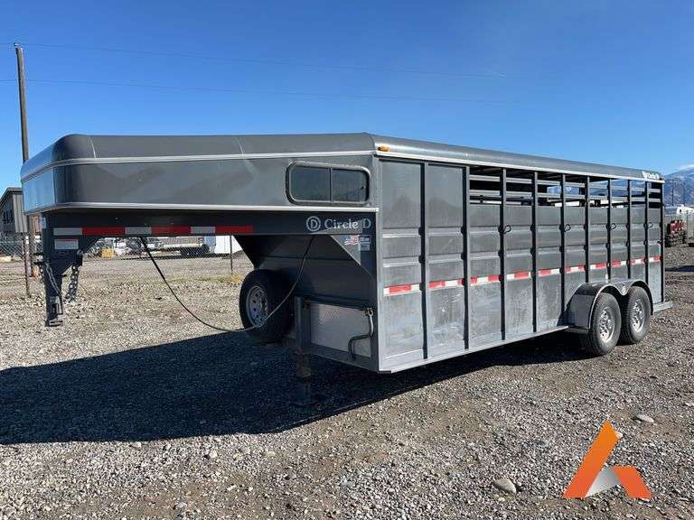 2022 Gooseneck Circle D Stock Trailer, GVWR 6350 lbs, tandem axle, side man door, center gate, repaired front left side panel, 82"W x 20'L (+ gooseneck 7'6"L), Tires ST235/80R16, Interior gate, Rubber floor mat, VIN: 4D3SG2826P1018549