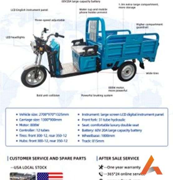 Unused 2025 IR Electric Tricycle IRET13, Vehicle Size: 106" x 38" x 52", Carriage Size: 51" x 35", Motor: 800W, Controller: 12 Tubes, Tires: Front 300-12, Rear 350-12, Hubs: Front 300-12, Rear 350-12, Instrument: Large Screen Lcd Digital instrument Pane, Front Fork: 31 Tube Hydraulic, Seat: Comfortable Luxury Double Seat, Battery: 60V 20A Large Capacity Battery, Wheelbase: 71", Track: 32" Assembly Required