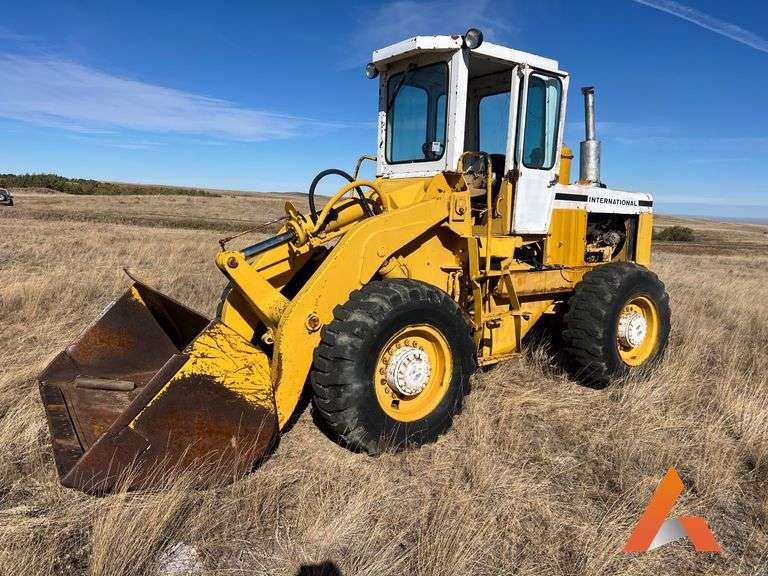 1973 International H65C Wheel Loader, 4 cylinder International diesel engine, 3 speed power shift transmission, 4WD, enclosed cab, 7' bucket, tires: 17.5-25, SN: 8460308U003281, per owner: new starter