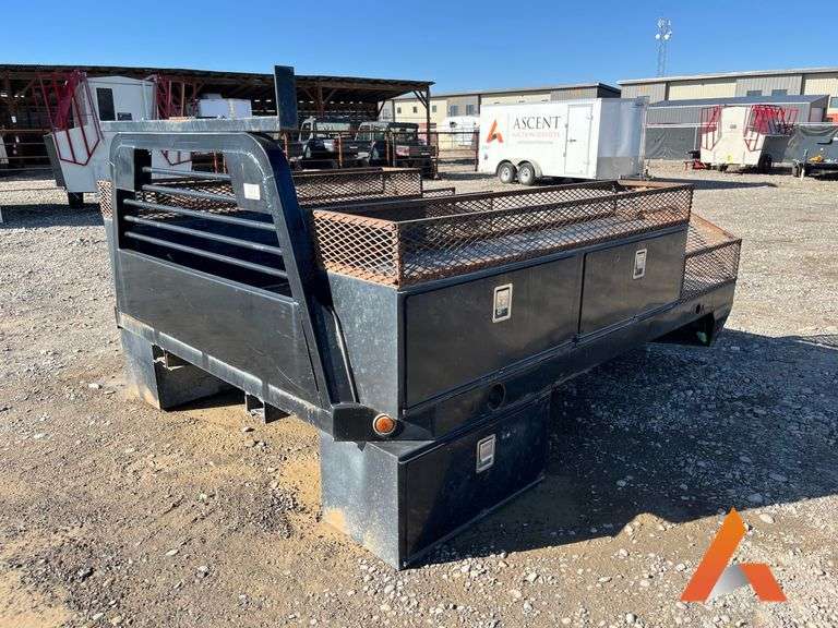 10' Truck Flatbed, 10' L X 8.2' W, 2" receiver hitch, access door for gooseneck hitch, (2) top tool boxes 84" L X 18" W X 18" H, (2) underbed boxes 36" L X 18" W X 18" H, wire baskets, (2) fuel fill ports